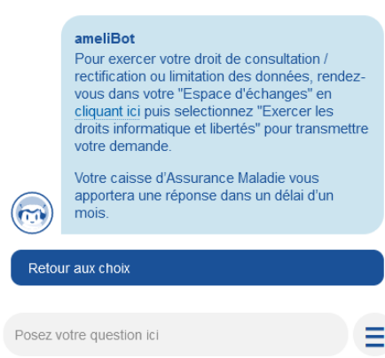 Cliquez dans le Chatbot sur « cliquant ici » une nouvelle page s’ouvre et aller dans exercer les droits informatique et libertés