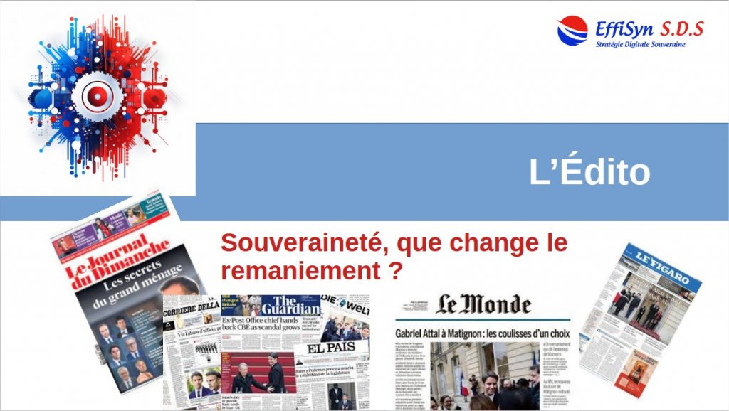 Compte tenu de la continuité à l’occasion de l’apparence du changement, le doute est permis. Le ministère de l’économie de de la souveraineté industrielle et numérique reste, toujours sous la direction de Bruno Le Maire, peut-on vraiment espérer un changement ? Pour le numérique, je suis encore plus pessimiste ; en effet après un secrétaire d’état pro géant américain de la tech, Cédric O, dont les derniers exploits ont défrayé la chronique (Capital 13 dec 23), suivi par une ministre délégué au numérique Jean-Noël Barrot qui était un ancien « Young Leader » de la fondation franco-américaine et qui n’a pas eu l’occasion de démontrer une vraie combativité sur la souveraineté numérique. Il ne manquerait plus que le prochain ministre délégué ou secrétaire d’état soit un ancien de McKinsey, pour que la messe soit dite !